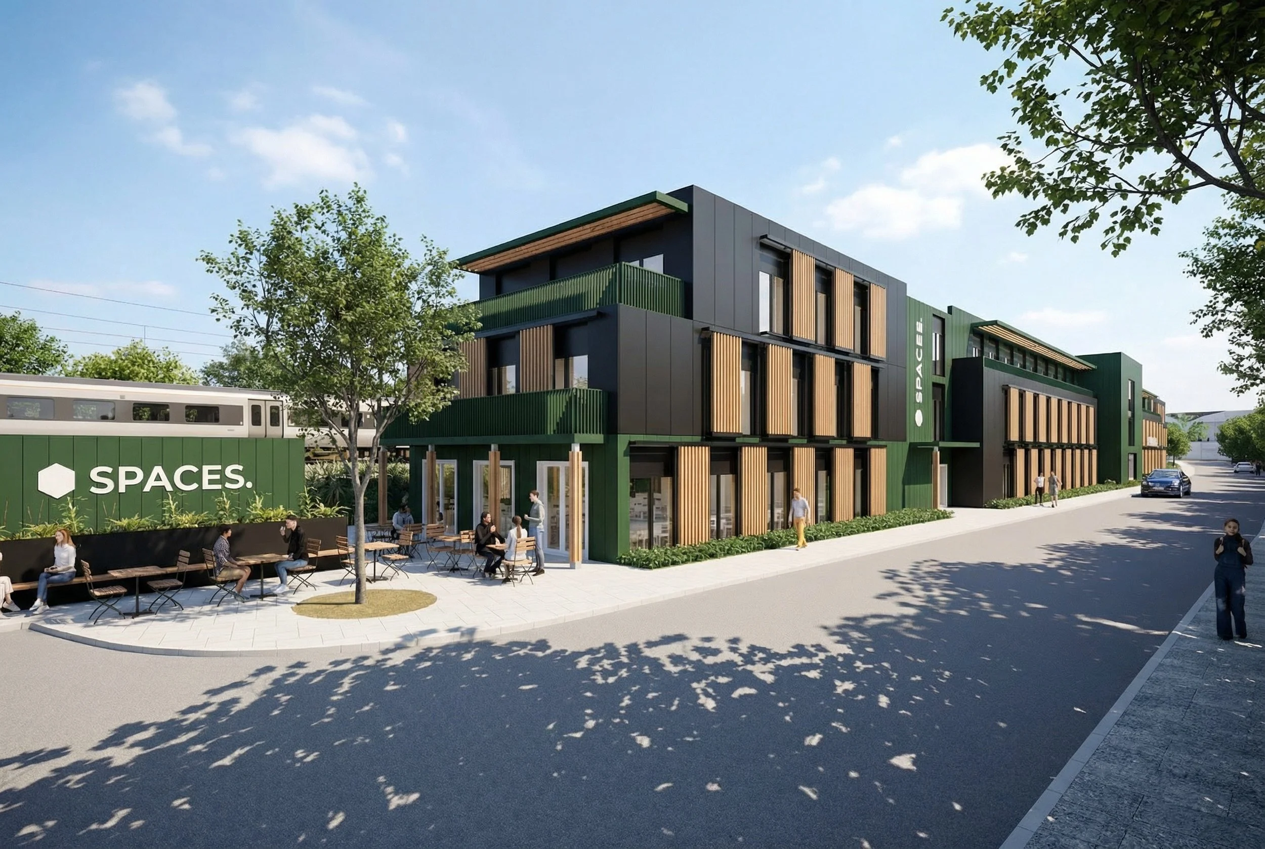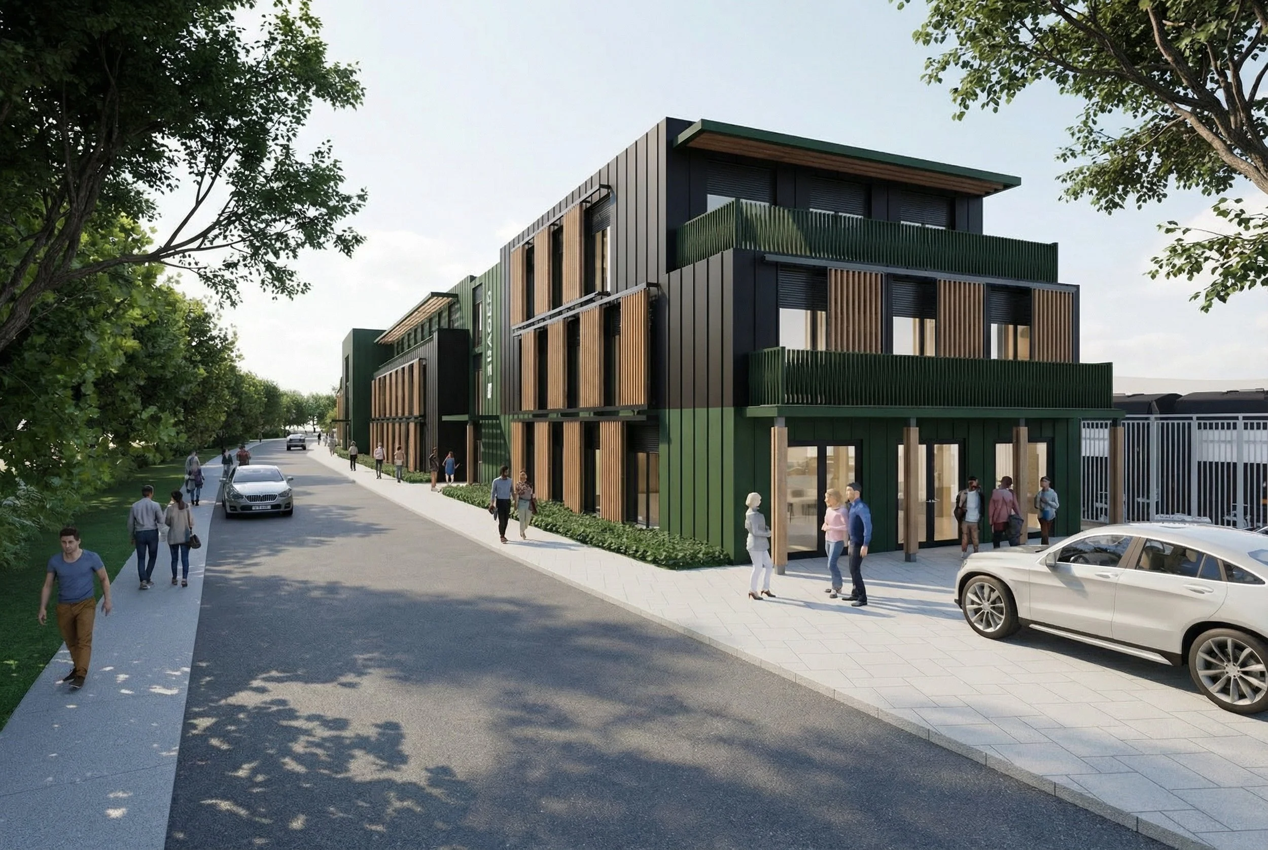 The three-storey building is designed to minimise visual impact along Station Road through a stepped-back top floor and articulated massing. Its facade uses two-tone black and green metal cladding, softened with timber solar shading and transparent ground-level glazing for active street engagement. Interior spaces extend outwards via third-floor terraces that support health and connection with the outdoors. The surrounding landscape references the site’s industrial heritage while introducing native fruit trees, raised beds, and communal seating areas. The architecture also incorporates habitat features such as bird, bee, and bat boxes.