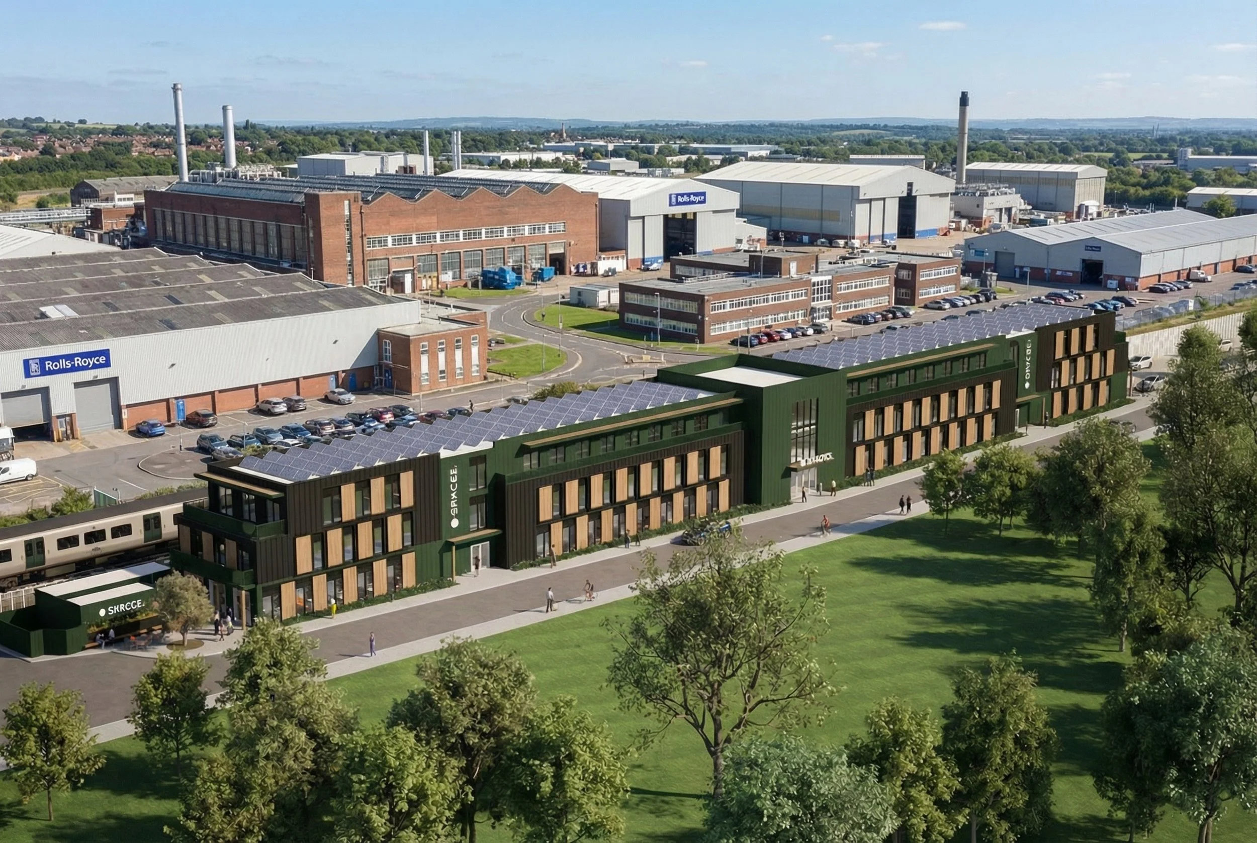 Form: The building is oriented for optimal solar gain and shading. Roof areas are reserved for PV arrays and plant infrastructure.